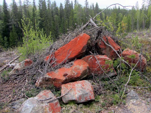 Oletkos nähnyt näin kauniita kiviä? Kuin punamultamaalia olisi päälle kaatunut. Ja näitä on seudulla useissa paikoissa.