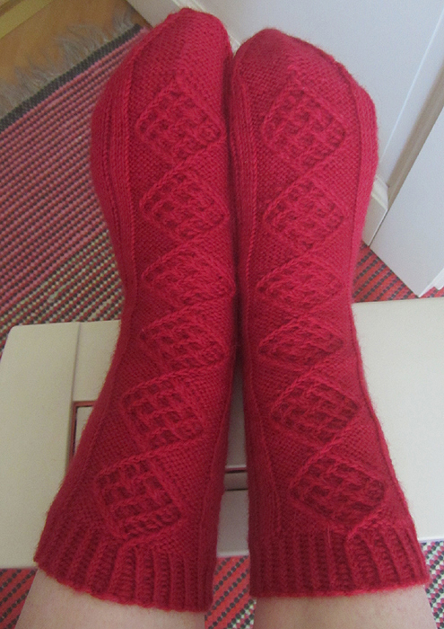 Ohjetta en noudattanut tarkoin, oikeastaan otin vain kaavion ja tein sitten oman versioni, joka kyllä on aika pitkälle ohjeen mukainen. Kantapää on tavallinen vahvistettu ja kärkeen tein nauhakavennuksesta muokatun version. Viimeisen vohveliruudun päätin ylimääräiseen kerrokseen, jossa kaavion keskimmäiset silmukat kudoin kiertäen yhteen.